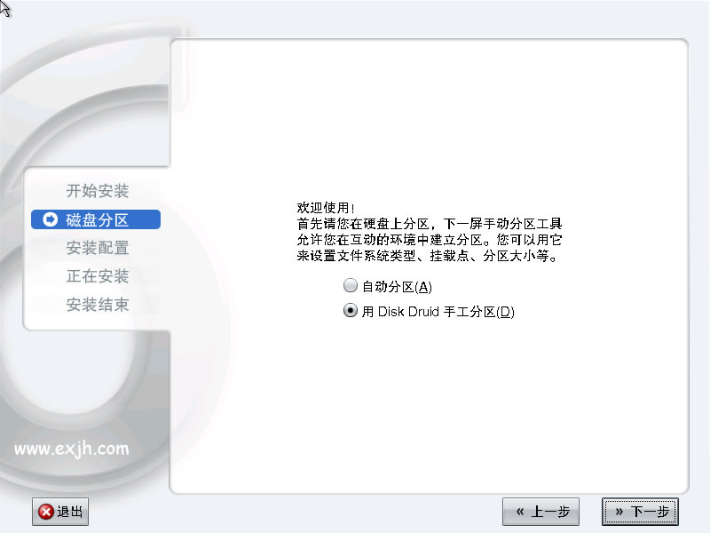 这是关键的一步,对我们准备好的两个分区进行格式化,这里我们选择“用Disk Druid手工分区”,点击“下一步”